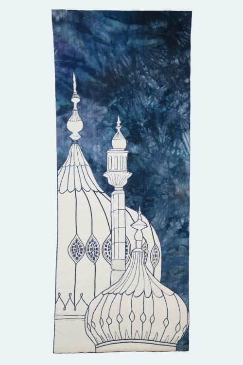 The beautiful depiction of the Royal Pavillion, the Prince Regent’s seaside retreat in Brighton, features on one side of the Region 2 (Kent, Surrey, East and West Sussex) banner. The background was hand-dyed and machine quilted first, and the pavilion was then appliquéd and stitched with a mixture of satin stitch and free-machine stitching using variegated threads, with some cording to give greater definition in the foreground. The other side features the iconic Oast houses found in Kent.