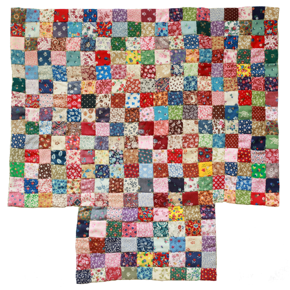 Mosaic patwork quilt made from many different prints and colours of cotton fabric, arranged randomly. The quilt is hand pieced over papers and tied at each corner of the squares. This miniature quilt was entered into a Qulilt Show, possibly the 1985 Bristol Exhibition. Made to fit the Oak Four poster miniature bed (in The Quilters' Guild Artefact Collection).