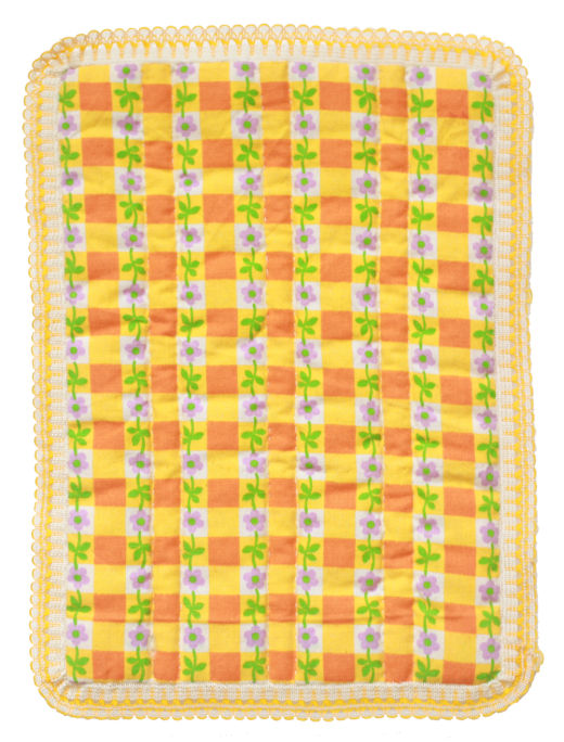 Printed yellow and orange floral cotton wholecloth miniature quilt, with the reverse forming a pouch, edged in nylon lace. Hand pieced and hand quilted. Made for a wooden cot/cradle (in The Quilters' Guild Artefact Collection).