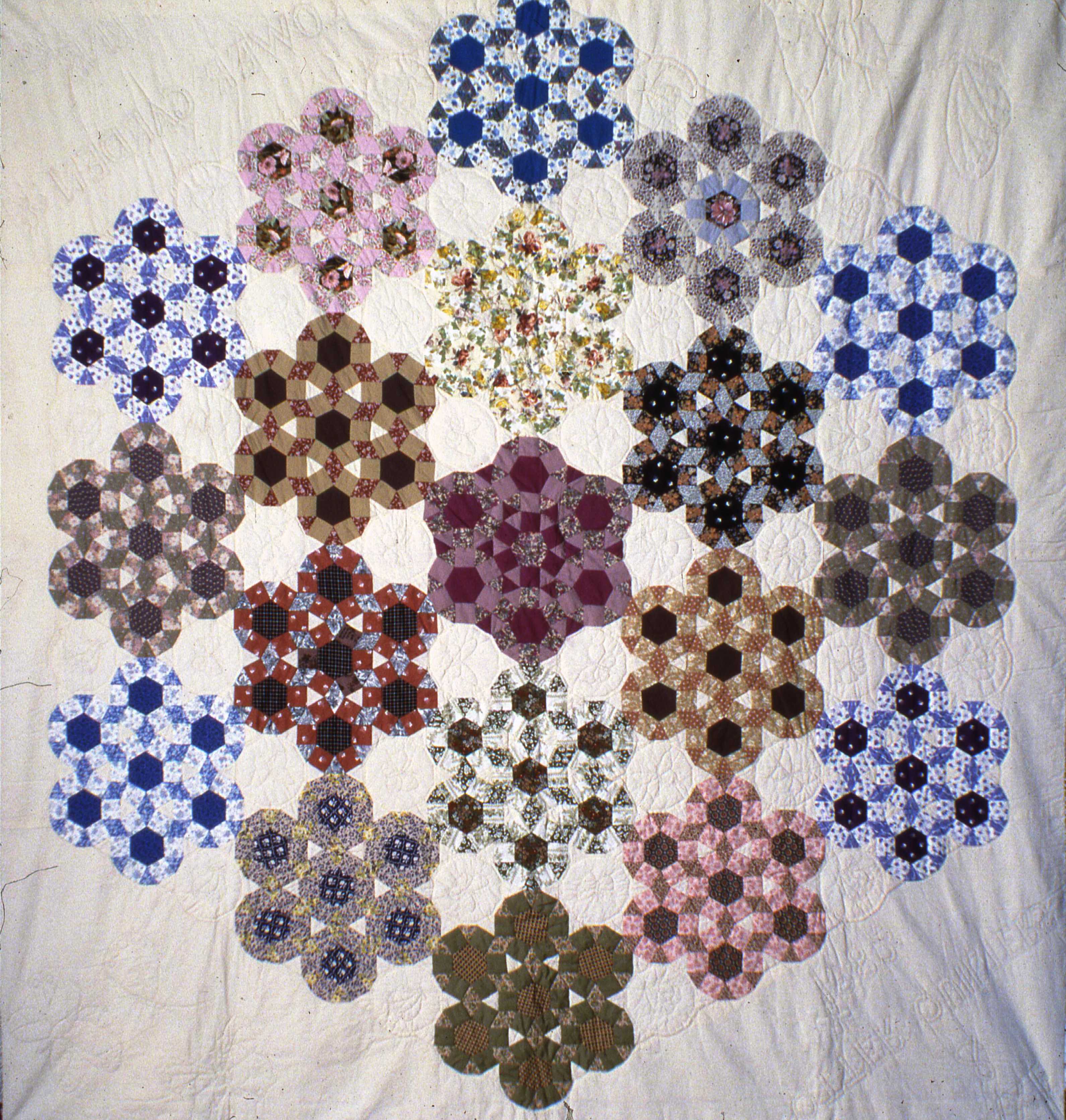 Various coloured cotton printed fabrics on a cream background, hand-pieced in decorative rosette design. The quilt has polyester wadding with an unbleached calico backing.